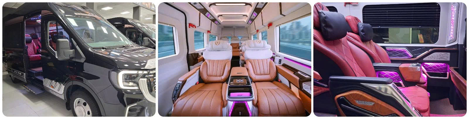 Nội thất: Trang bị ghế da cao cấp massage, sưởi ấm, chỉnh điện đa năng. Hệ thống ánh sáng LED đổi màu, quầy bar mini, tủ lạnh, màn hình LCD giải trí riêng biệt. Không gian: Riêng tư tuyệt đối, thiết kế khoang cabin cách biệt hoàn toàn với tài xế qua một vách ngăn kính điện.